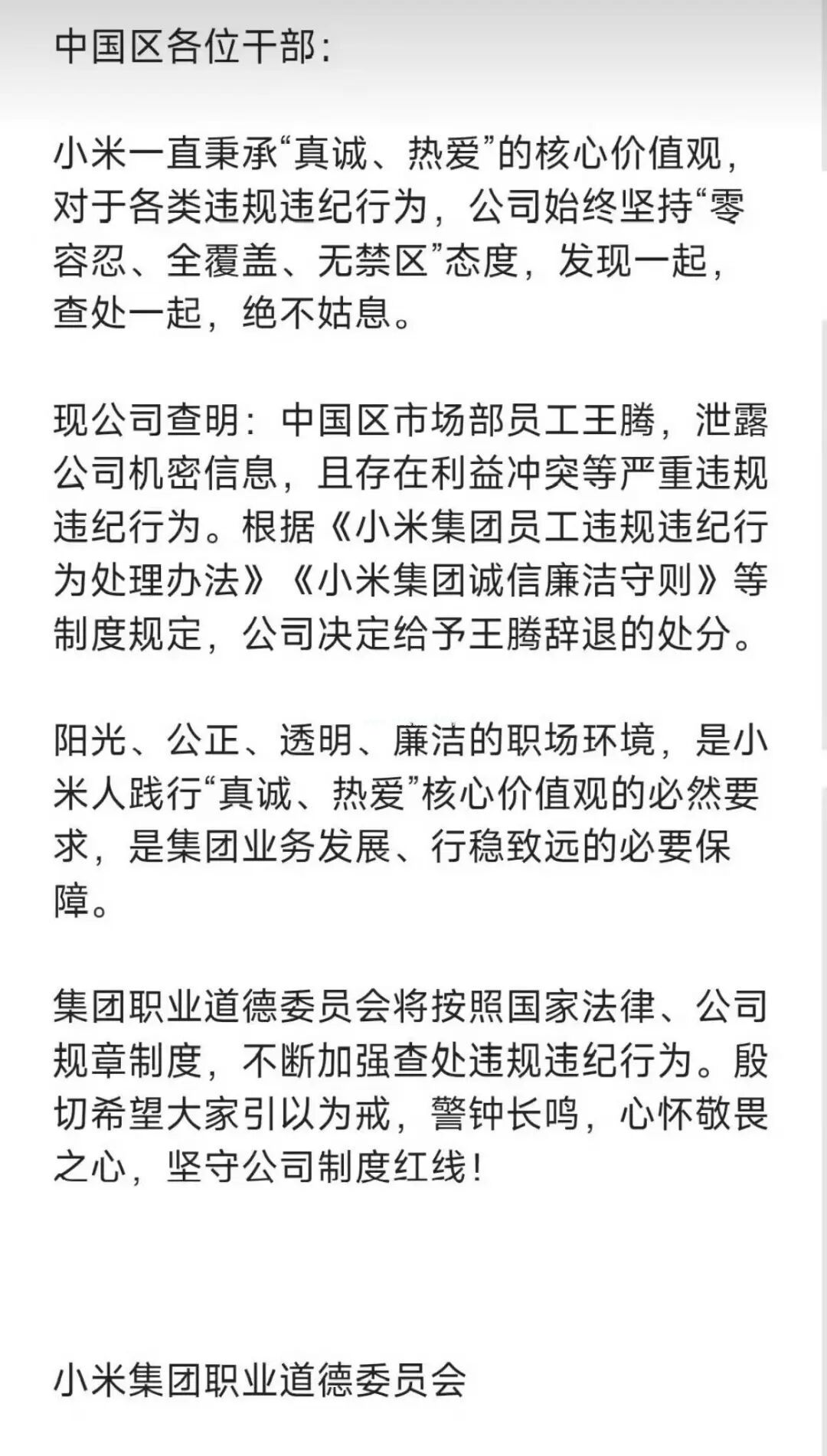9月8日深夜,根据一封标注时间为2025年9月8日22:15、由小米集团职业道德委员会发出的邮件,小米中国区市场部员工王腾,泄露公司机密信息,且存在利益冲突等严重违规违纪行为。根据《小米集团员工违规违纪行为处理办法》《小米集团诚信廉洁守则》等制度规定,公司决定给予王腾辞退的处分。