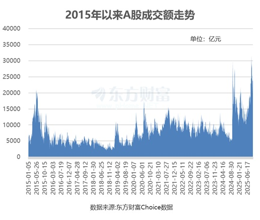 虽说此后三大指数震荡走低,但这一天A股成交额高达3.49万亿元,创下了A股的历史新纪录。东方财富Choice数据显示,截至9月22日收盘,A股有5个交易日成交额超3万亿元,除了2024年10月8日这一次,其余4次均发生在2025年8、9两个月。