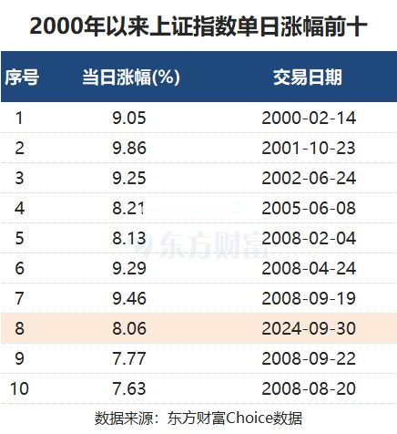 事实上,2000年以来,上证指数涨幅超过2024年9月30日的情形,是寥寥无几的。东方财富Choice数据显示,2000年以来,上证指数只有7个交易日的涨幅超过了2024年9月30日。其中2000年2月14日当天,上证指数大涨9.05%,为2000年以来上证指数最大单日涨幅。而从前十大涨幅的交易日来看,2008年是一个集中的年份,有5次发生在这一年。
