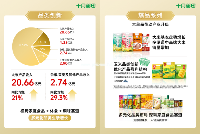 业绩报告显示,2025上半年十月稻田大米产品收入20.66亿元,同比增长21%,玉米产品则以营收4.33亿元成为第二大品类。十月稻田在巩固大米基本盘的同时同步推动品类创新,逐步拓展玉米、杂粮、干货等品类,并进一步开发出黄油手抓饼、玉米浆包、沙拉汁、欧芹大蒜盐等便捷家庭食品。至今,已成功构建起覆盖“主食+休食+调味”三大板块的多元化产品矩阵,满足更多家庭的多样化需求。