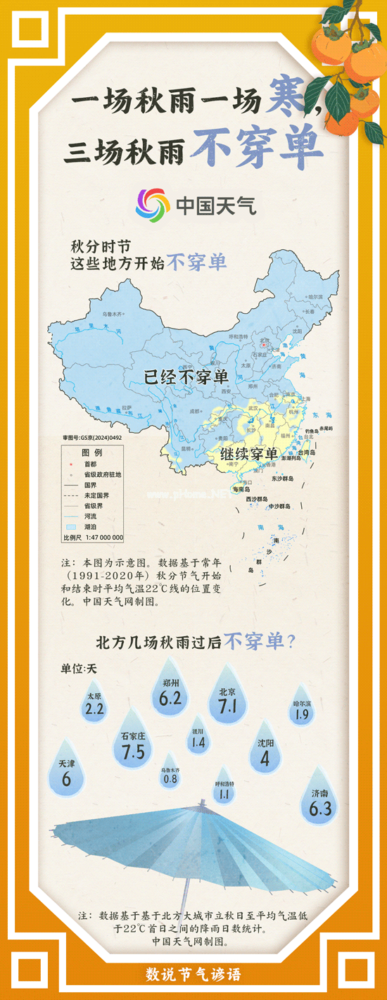 民间常用“一场秋雨一场寒,三场秋雨不穿单”来形容初秋时节北方地区气温快速下降的情形。中国天气网盘点大数据发现,常年来看,秋分开始时,长江以北地区在经历秋雨的“洗礼”后,平均气温已经降至22℃以下,穿短袖等单衣出行已经有点凉了,随着气温下降,在秋分结束时,“不穿单”的区域则将会扩展至南岭一带。