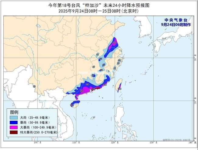 降水预报:24日08时至25日08时,广东大部、广西东部和南部、福建东部和南部、海南岛北部和西部、台湾岛东部、江苏中部、安徽中南部、湖北东部、江西北部、东部和西南部、浙江东部等地部分地区有大到暴雨,其中,广东中南部、福建东南部、海南岛西部、台湾岛东南部、江苏中部、安徽中部等地部分地区有大暴雨,广东东南部沿海和西部等地局地特大暴雨(250~270毫米)。