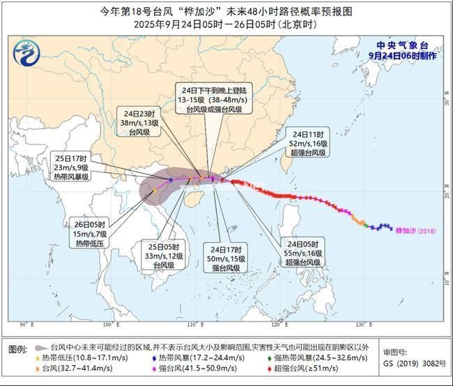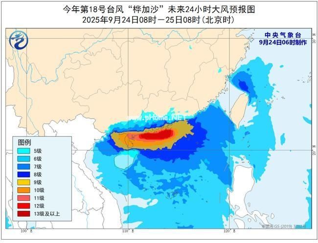 大风预报:24日08时至25日08时,巴士海峡、南海大部、西沙群岛、中沙群岛、南沙群岛、东沙群岛及黄岩岛附近海域、台湾海峡、台湾以东洋面、东海南部、北部湾、琼州海峡、福建沿海、广东南部地区及沿海、珠江口区、海南岛沿海、广西沿海、台湾岛沿海将有6-9级大风、阵风10-11级,其中,广东沿海和南海北部的部分海域风力有10-13级、阵风14-15级,台风中心经过的附近海域或地区风力可达14-15级、阵风16-17级。