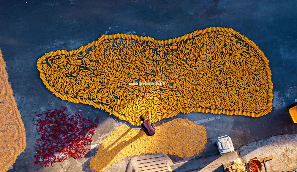 ↑2025年9月11日,工人在甘肃省张掖市高台县南华工业园区翻晒制种玉米。(无人机照片)CICPHOTO/王将 摄