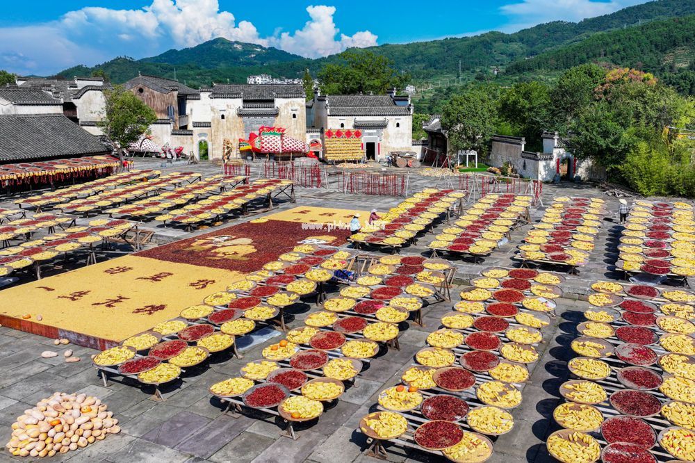 ↑2025年9月15日,农民在安徽省黄山市徽州区呈坎村晾晒稻谷、玉米、南瓜、红辣椒、笋干等农作物。(无人机照片)CICPHOTO/潘祯祥 摄