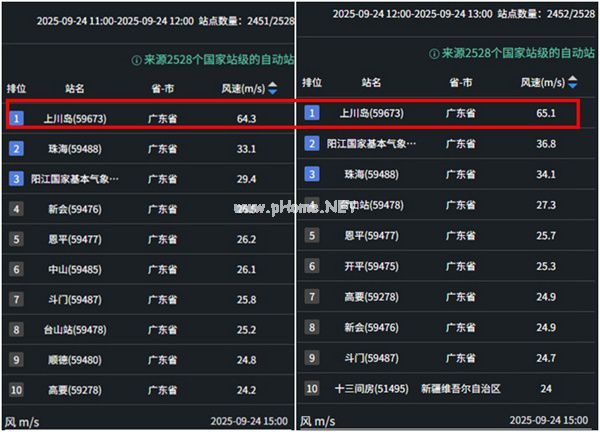 今天8时至13时,广东阳江上川岛持续测得13级以上阵风,其中11-12时、12-13时连续两个时次测得17级以上阵风。12时55分,上川岛测到65.1米/秒的阵风,打破当地、也是广东省内国家级气象站的风速纪录。这之后,上川岛当地气象站的数据还一度中断。