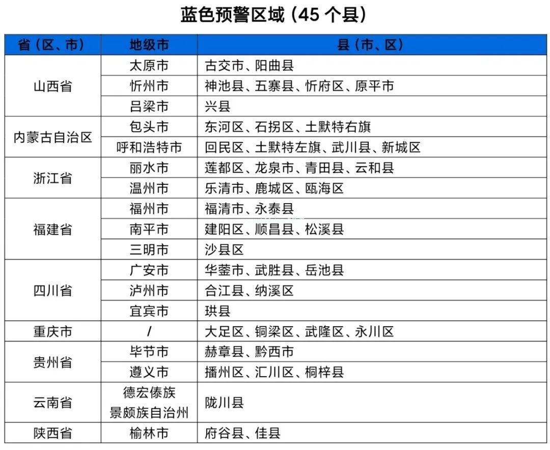 预计,7月8日20时至7月9日20时,山西北部、浙江南部、福建东北部、四川东南部、重庆西南部、贵州西北部、云南东北部和西部、陕西北部等地部分地区发生山洪灾害可能性较大(黄色预警),其中,福建东北部、四川东南部、贵州西北部局地发生山洪灾害可能性大(橙色预警),预警区域涉及的县(市、区)见下表。其他地区也可能因局地短历时强降水引发山洪灾害,请各地注意做好实时监测、防汛预警和转移避险等防范工作。