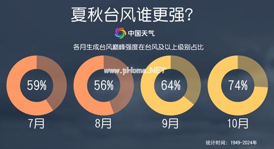虽然夏季台风的生成数量是一年中最多的,但从各台风的巅峰强度来看,秋台风的实力更胜一筹。1949年至2024年数据显示,7月和8月的台风,巅峰强度在台风及以上级别占比不足60%(在当月台风总数中的占比),而9月和10月台风的巅峰强度达到台风及以上级别的占比都超过60%,其中10月高达74%。