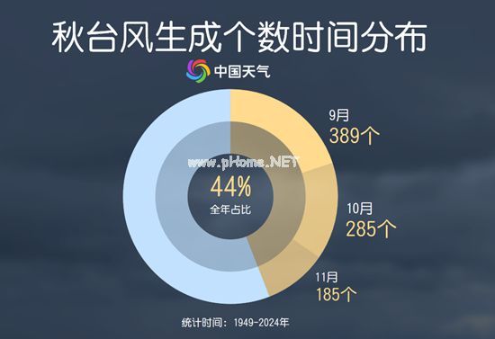 通常,我们把6月至8月生成的台风称为夏台风,9月至11月生成的台风称为秋台风。中国天气网统计显示,1949年至2024年间,夏季生成台风个数为867个,为台风最活跃季节,而秋季也有859个台风生成,全年占比44%,仅次于夏季。