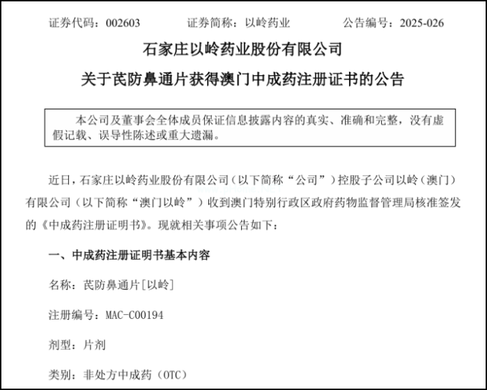 首个澳门注册上市创新中药!以岭药业芪防鼻通片添“新身份”